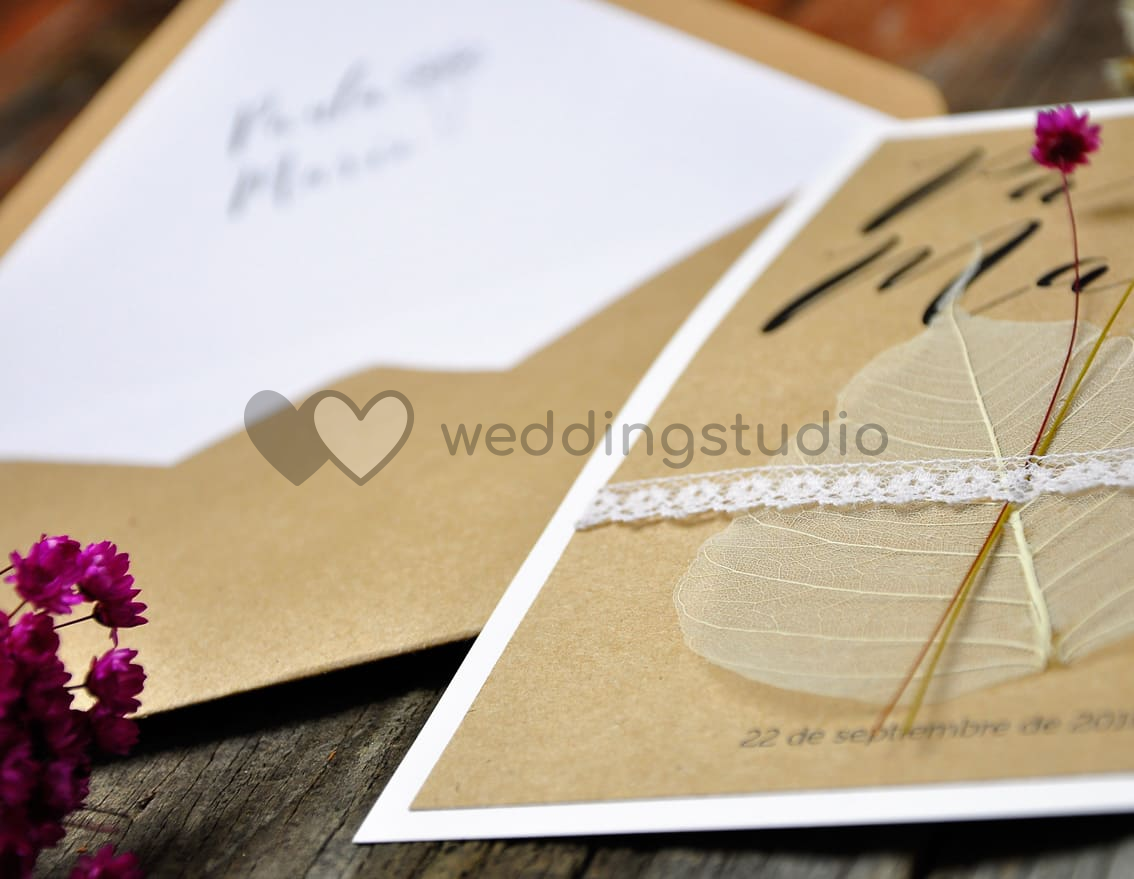 INCLUYE: Tarjetón + sobre (forro interior personalizado incluido) + flor seca + blonda blanca + hoja seca
