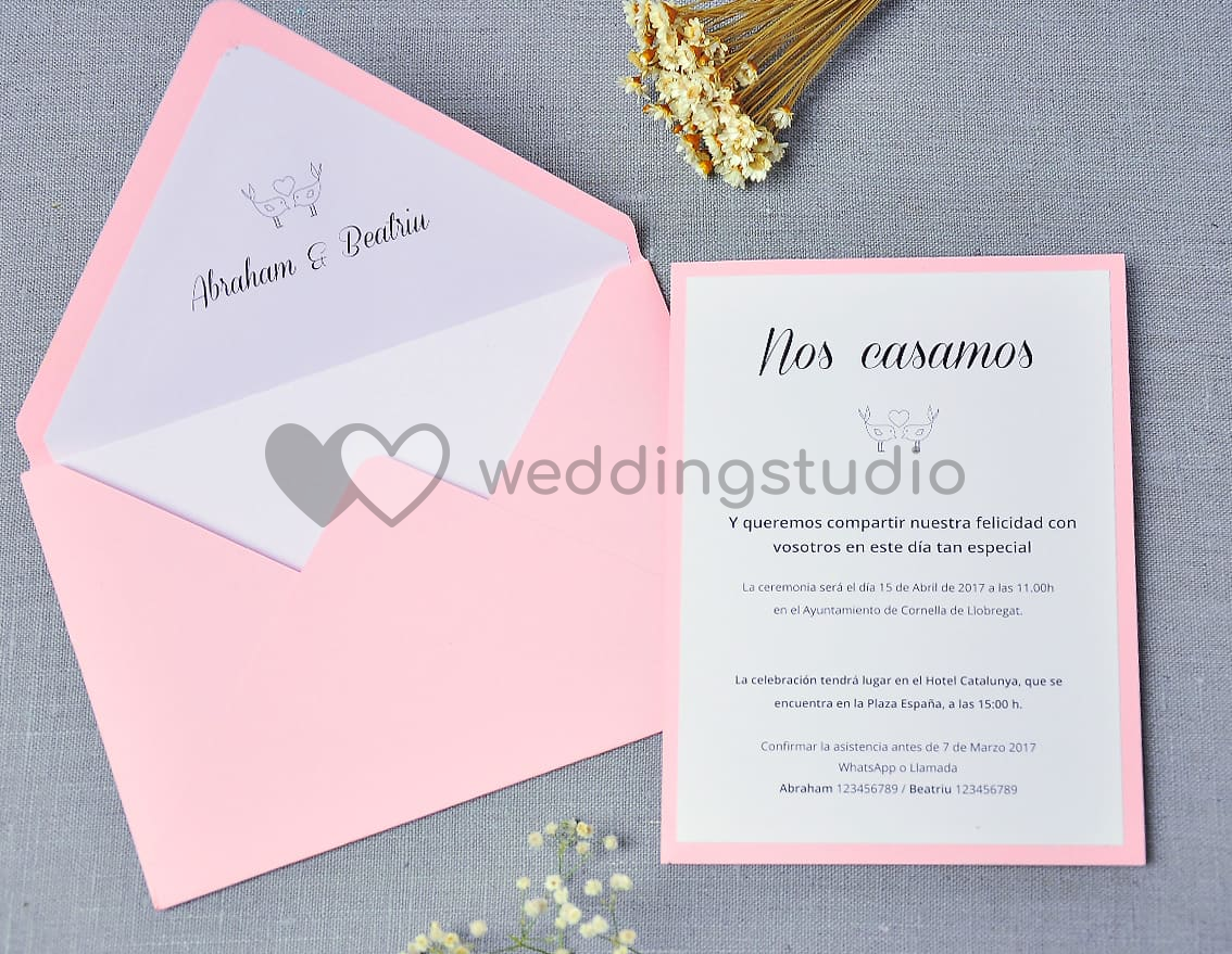 ¿Vuestra felicidad no os recuerda a esta invitación? Esta combinación de colores suaves y la tipografía rizada que da juego a la blonda, transmiten taaanto cariño y amor que hacen soñar a las novias con su vestido ideal.