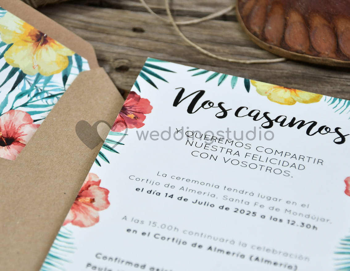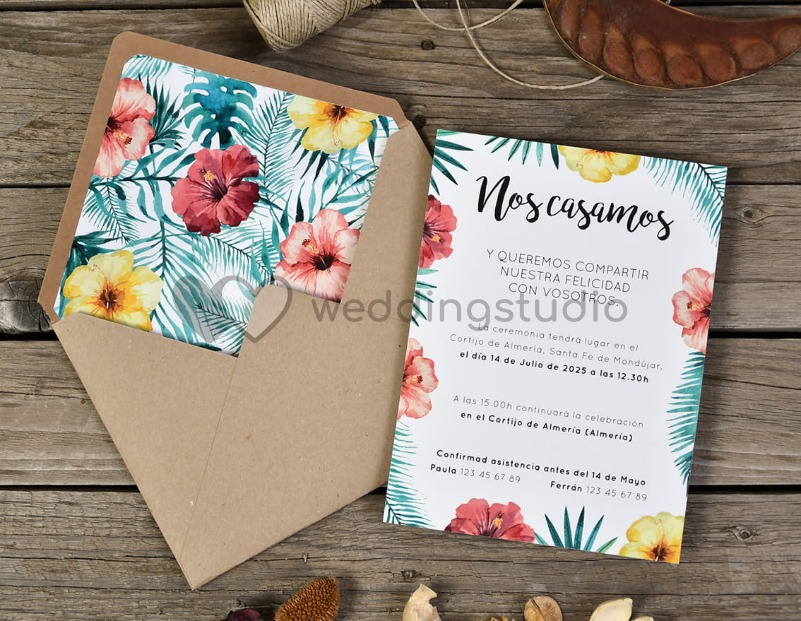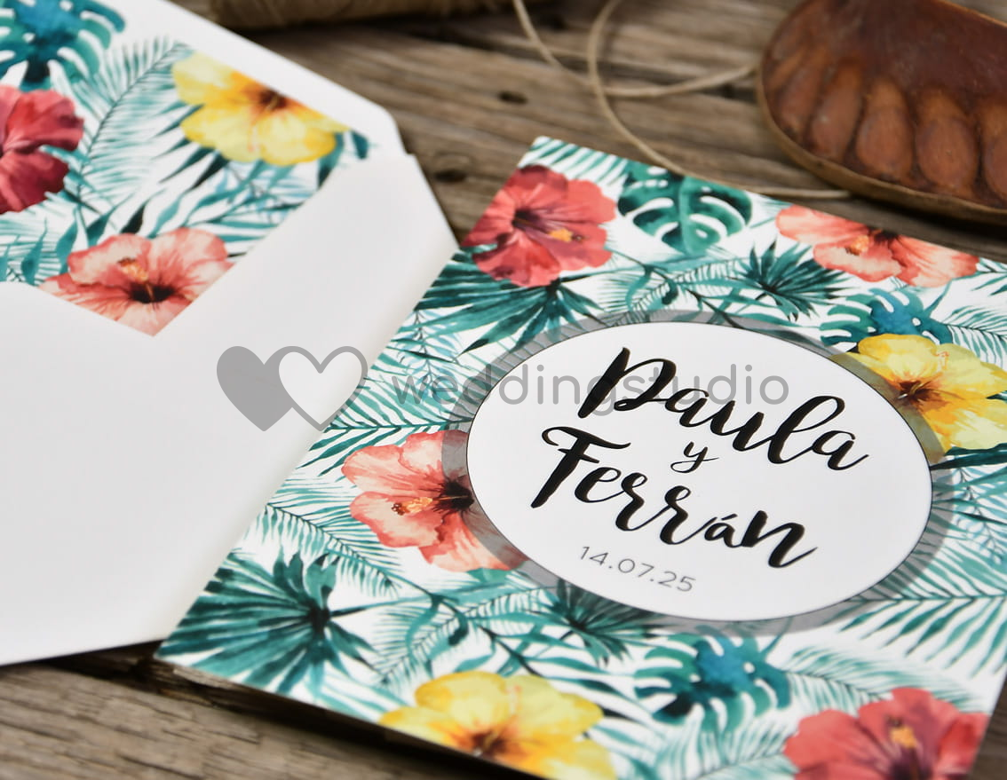 ¡Vaya invitación más increíble! Con su sobre forrado y sus colores con las hojas tropicales, contagiará a todos tus invitados las ganas de divertirse. La invitación es perfecta para bodas modernas y que desprenden mucho amor.