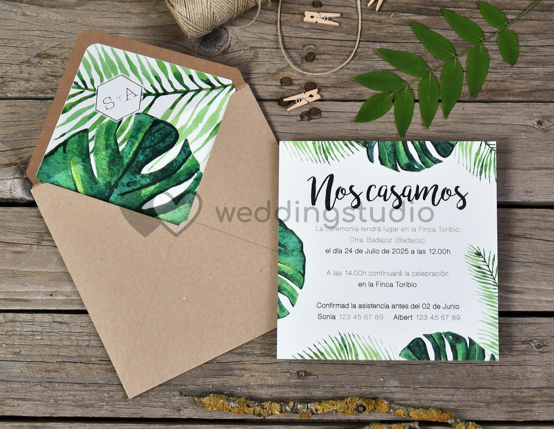 ¡Vaya invitación más increíble! Con su sobre forrado y sus colores con las hojas tropicales, contagiará a todos tus invitados las ganas de divertirse. La invitación es perfecta para bodas modernas y que desprenden mucho amor.