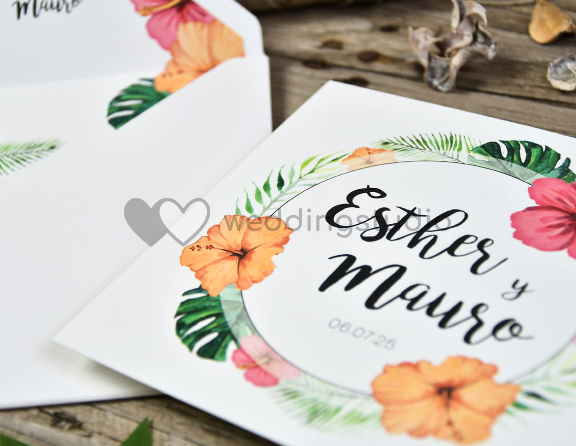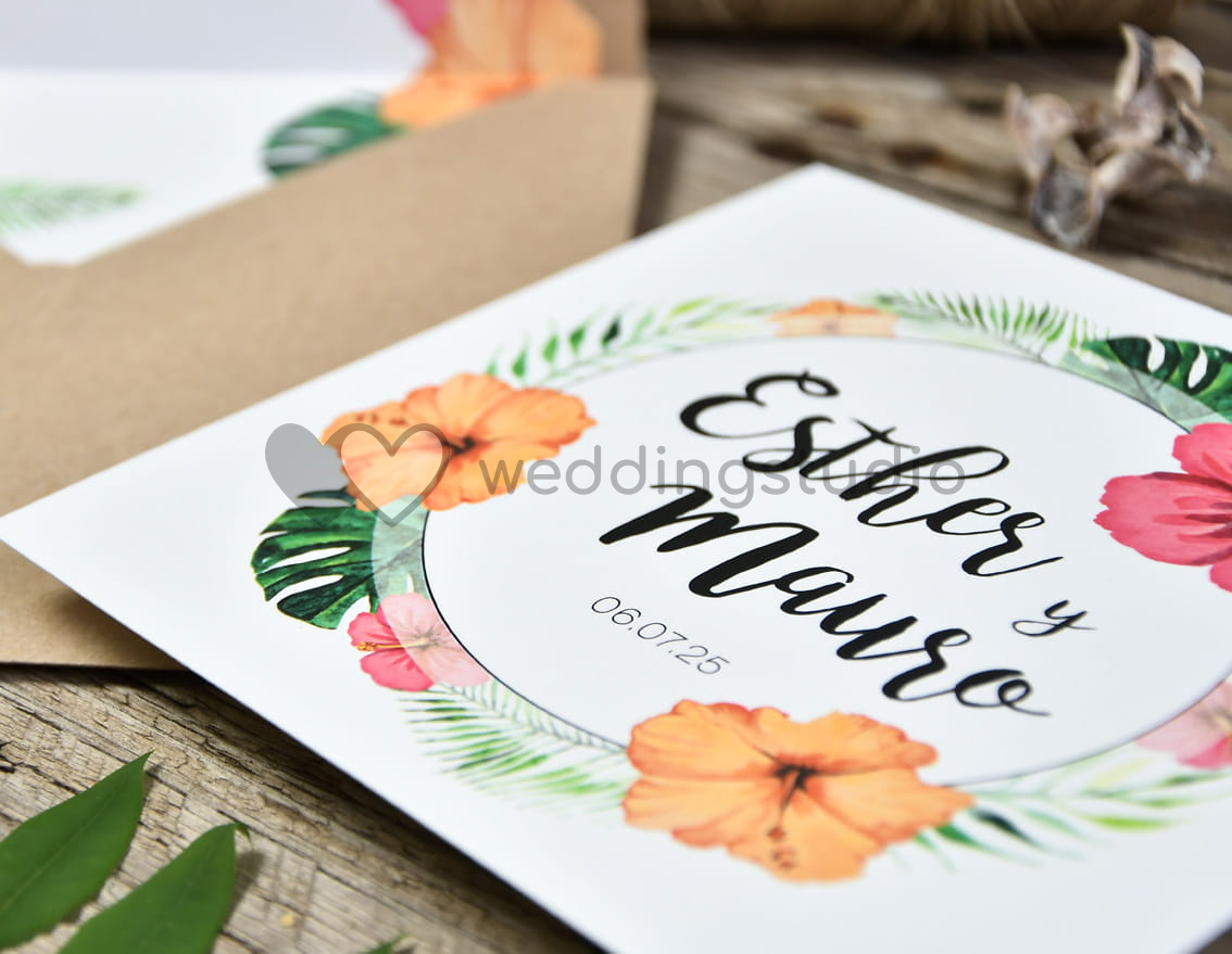 ¡Vaya invitación más increíble! Con su sobre forrado y sus colores con las hojas tropicales, contagiará a todos tus invitados las ganas de divertirse. La invitación es perfecta para bodas modernas y que desprenden mucho amor.